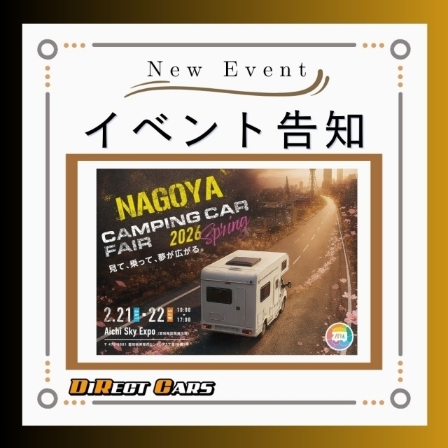 2月21・22にセントレアの国際展示場にて開催される『名古屋キャンピングカーフェア2026 in spring』にてダイレクトカーズより15台車両を出展いたします◎