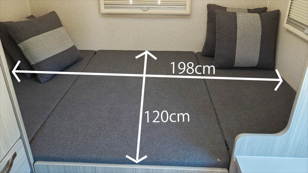 続いてリアベット(ダブルベット)です。ベッドサイズは、198cm×120cmとゆったりしたサイズです。2段ベッドではないので、上部にも余裕があります(天井までの高さ113cm)。