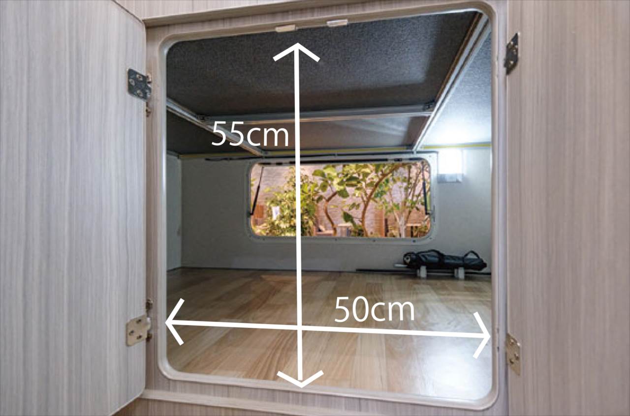 そして、後ろには105cm×45cmのリアゲートがあります。ベッド下の広いスペースが収納として使え、大きめの荷物を出し入れするのにも便利です。