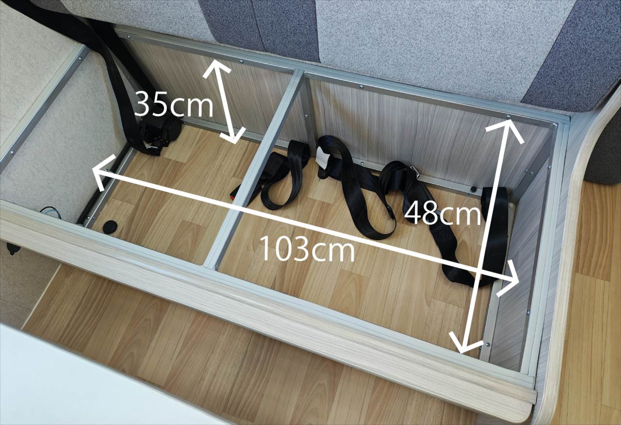 外装部分で紹介したようにベッドの下は大容量の収納となっています。車内からもアクセスできる扉がリアベッドの下にあるので、その分ベッドの高さは76cmと少し高め。乗り降りにはお気を付けください。