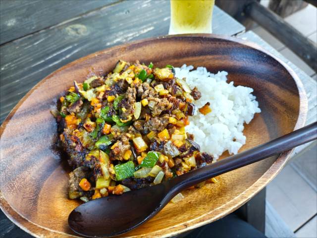 アヒージョ、猪肉のハンバーグを経て、しめは猪肉のドライカレー!旨味がギューッと詰まって、ビールにもピッタリ。「猿田彦BASE」のジビエ料理は、臭みもなく本当に美味しいお肉なので、オススメですよ~!
