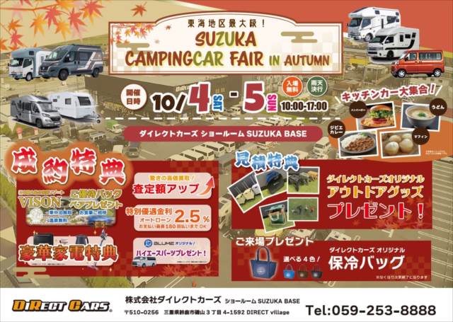 「ダイレクトカーズ」では10月4日(土)~5日(日)に「鈴鹿キャンピングカーフェア」が開催されます。次回のコラムでは、このイベントについて詳しくお伝えする予定です。お楽しみに!