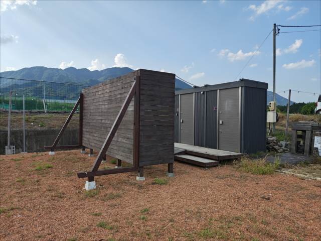 そして、このレンガチップエリアには、24時間利用可能なトイレがあります。入口が見えにくいように配慮されているのもありがたいですね。