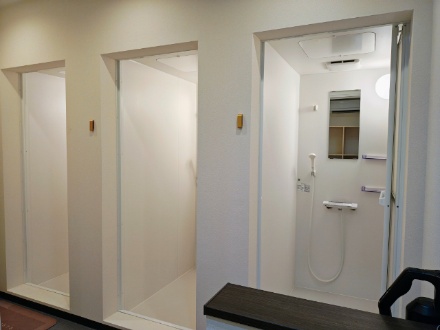 場内の共有施設として、嬉しいのは宿泊者は無料で利用できるシャワールーム。男女それぞれ3ブースあり、広めの設計になっているのでお子様と一緒に入ることもできます。無料なので、滞在中に何度か使うことができるのはありがたいですね。