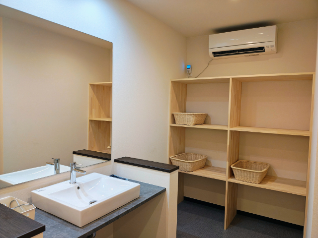 脱衣所にはエアコン、ドライヤーも完備されています。夏も冬も快適に過ごせますよ。