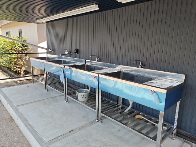 炊事場はシャワー棟の横にあります。お湯も出るので冬場も安心です。