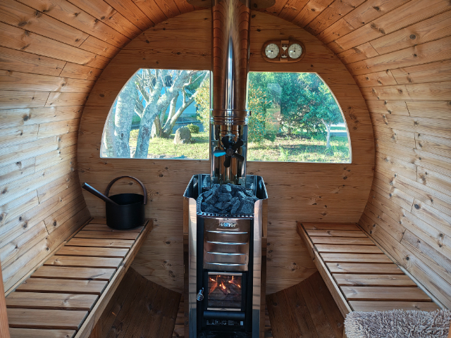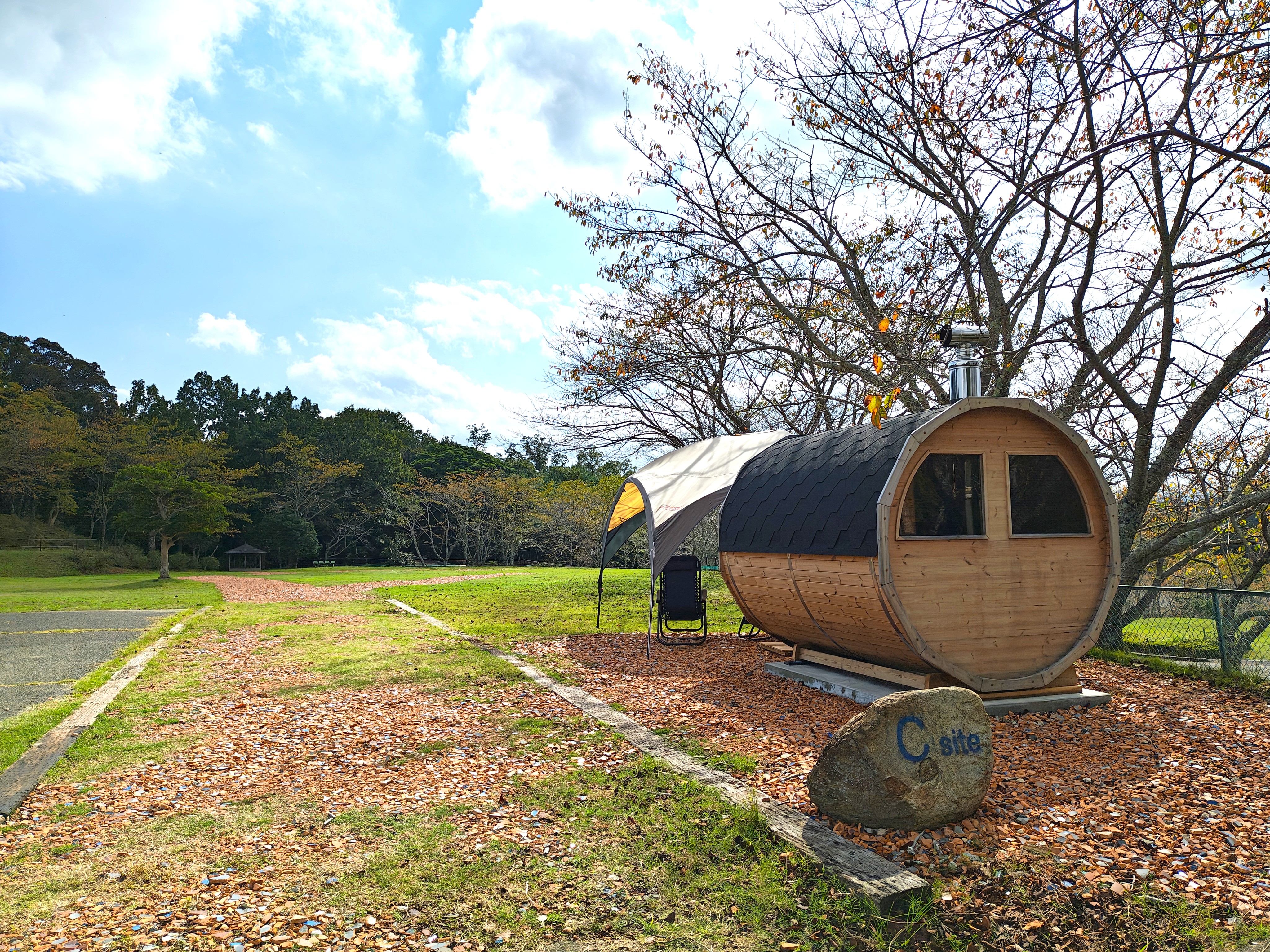 実は今回の取材の数日前に、「オートパークガーデン白山」には、サウナが設置されました。しかも本場フィンランドからの直輸入「SAUNIA」のバレルサウナです!「SAUNIA」は北欧を中心に40年の販売実績のある会社で、日本ではキャンプ場やグランピング施設、ホテル、旅館など全国70カ所ほどに設置されています。