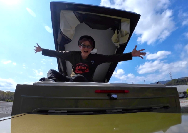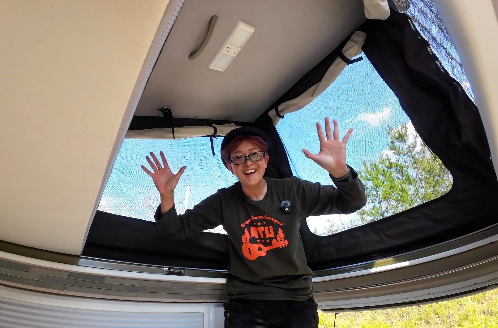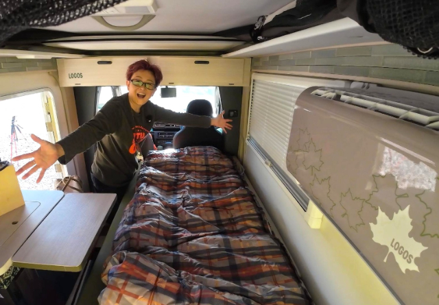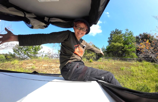 翌朝、風もなく穏やかな一日のスタートです!ポップアップルーフを試してみました!ポップアップルーフをあげることで車内の空間も広くなり、立ち上がれるので着替えする時にも便利です。ちなみにこの写真は、ベッドの上に立っているのですが、まだまだ高さに余裕がありますね。