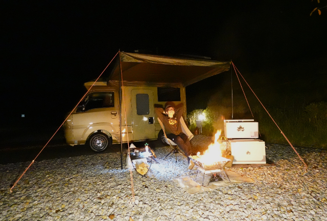 車内ではベッドを拡張して、明るい内に就寝の準備も済ませました!屋外では、焚火の準備もできています。