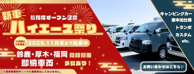 現在「ダイレクトカーズ」ではハイエース祭りを開催中(2025年11月末まで)です。既存モデルを始め、即納車両など様々なモデルがありますよ。ハイエースの中古車が高騰している中、ダイレクトカーズの新車ハイエースをご体感くださいね!