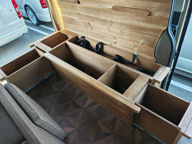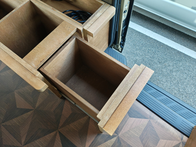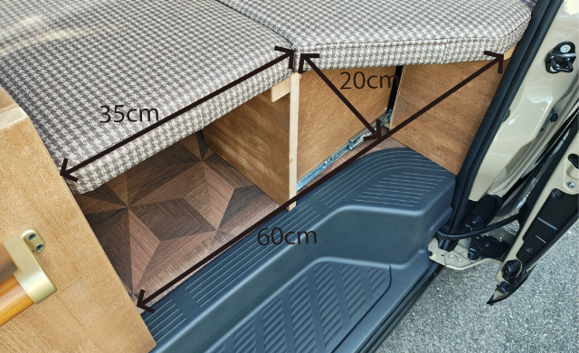 写真のように、スライドドア側とリアゲート側の2カ所の収納スペースは引き出しになっていて、これを引き出すとベッド展開する際のベッドマットを置く台になります。
