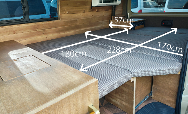 ベッドのサイズはこんな感じです。最長228cm×幅170cm、大人3人が寝られる広いベッドになります。冷蔵庫の部分は短くなっていますが、それでも180cmあるので、身長158cmの私は余裕で寝られました。