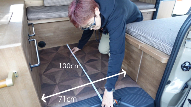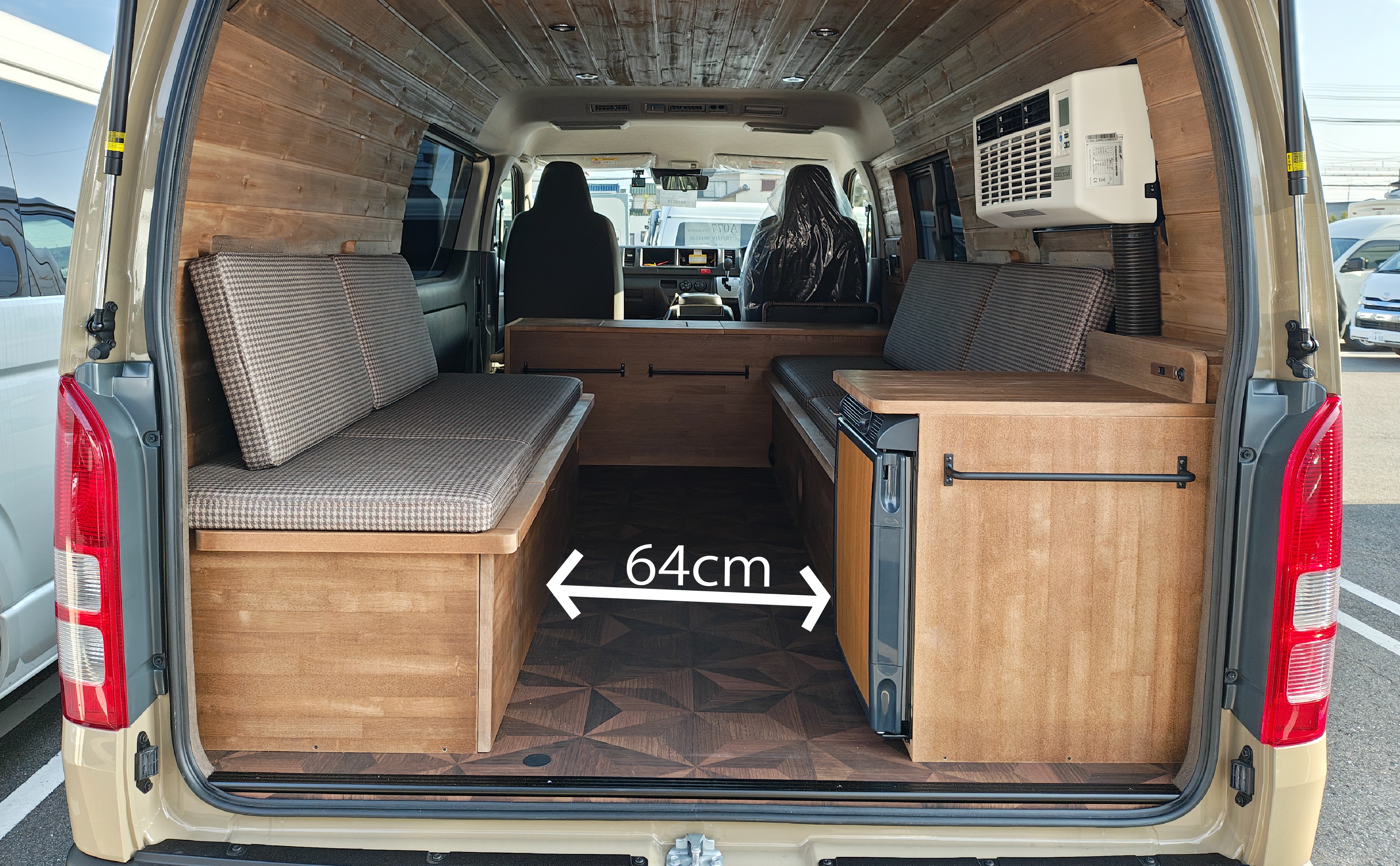 今度は再びベンチシートに戻して、サイズを測っていきます!まずシートの間の通路幅が64cmでした。通路としても対面で座るシートとしても十分なサイズ感ですね!
