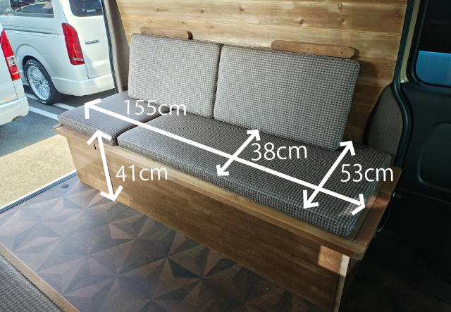 助手席側のベンチシートのサイズは155cm×53cmです。背もたれのクッションマットを立てかけると、奥行きは38cmほどになります。ベンチの高さは41cmです。運転席側はベッドモードの時に測った通り、全長が180cmあり、奥行き、高さは助手席側と同じです。ちなみにシートベルトは助手席側のベンチシートには2名分、運転席側のベンチシートに1名分あります。