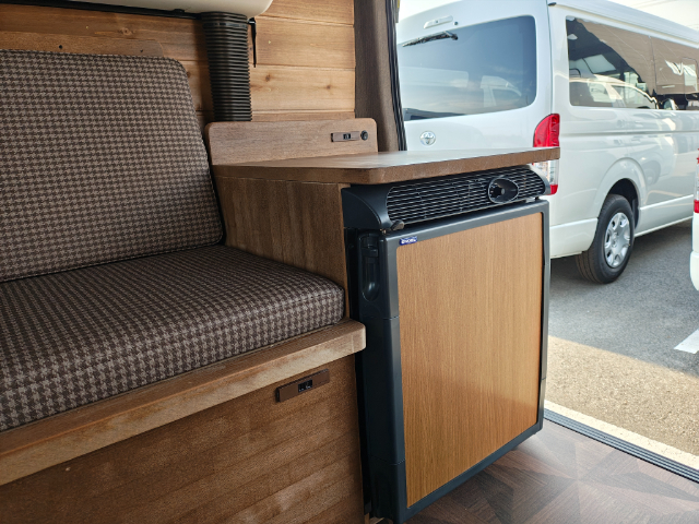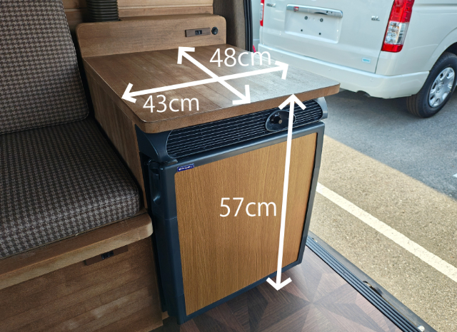 運転席側の後部にある冷蔵庫は40Lで標準装備となっています。室内からも車外からもアクセスしやすい場所にあるので便利ですね!冷蔵庫の上をテーブル(48cm×43cm)として使う事もできます。コンセントが1口ついているので、就寝時のスマホの充電などにも使えます。