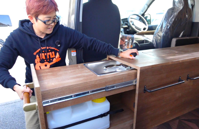 ハンドルを引くと、ギャレー部分がスライドアウトします!キャンプなど屋外で調理をする場合にも大変便利です。シンクの下には、12Lの給水タンク、排水タンクが2つ並んでいます。引き出すことでタンクの出し入れも容易にできますね!