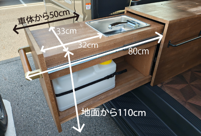 引き出した部分を測ってみました。車体から50cmほどの余裕があれば引き出せます。また引き出した場合の地面からシンクまでの高さは110cmです。