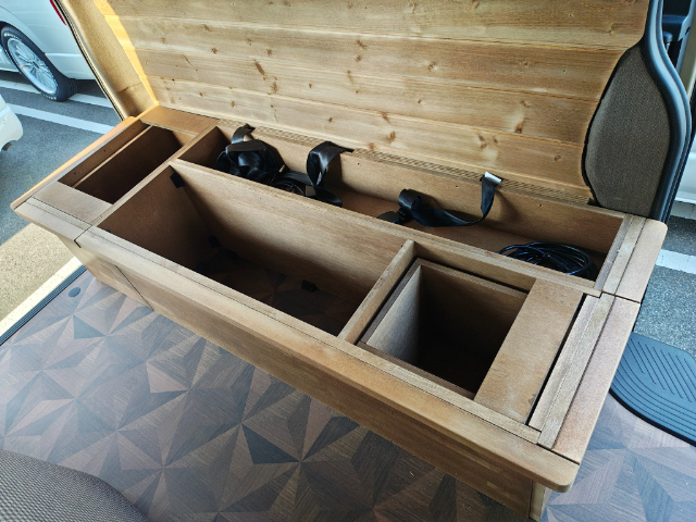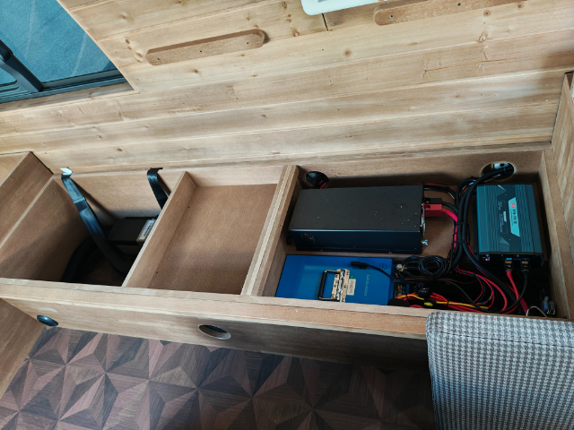 続いて、運転席側のシート下の収納をご紹介します。こちら側のシート下は3つのエリアに分かれていて、最後部には標準装備のリチウムイオンバッテリー(200A)、1500Wのインバーター、走行充電システムなどが入っていますので、収納としては使えません。