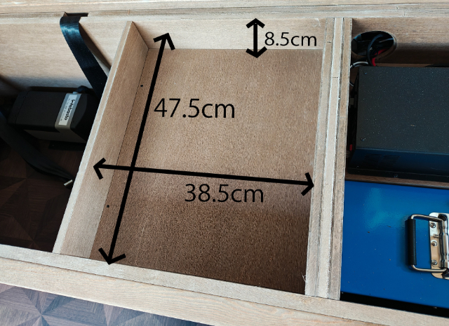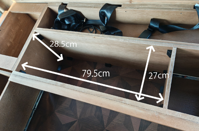 その2つの引き出し収納の間には2つの収納スペースがあります。通路側のスペースは、79.5cm×27cm×深さ28.5cmと大き目の収納になっています。