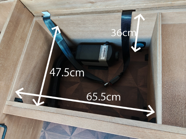 そして最前部のスペースには、オプション装備のFFヒーターが入っていました。FFヒーターが必要ない方はこの場所も47.5cm×65.5cm×深さ36cmの収納スペースとして使えます。またここには1名分のシートベルトがあります。