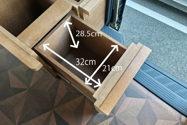 スライドドア側の引き出し収納のサイズは、21cm×32cm×深さ28.5cmです。スライドドアからもアクセスしやすいので、車外で使うものを入れておくのもいいですね。