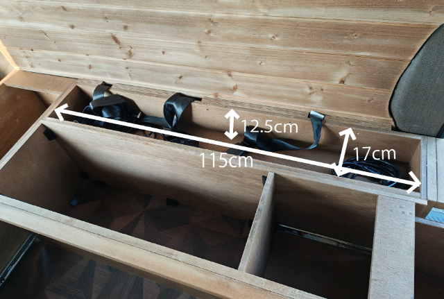 壁側には、115cm×17cm×深さ12.5cmと浅く細長いスペースがあります。ここには2名分のシートベルトがあります。