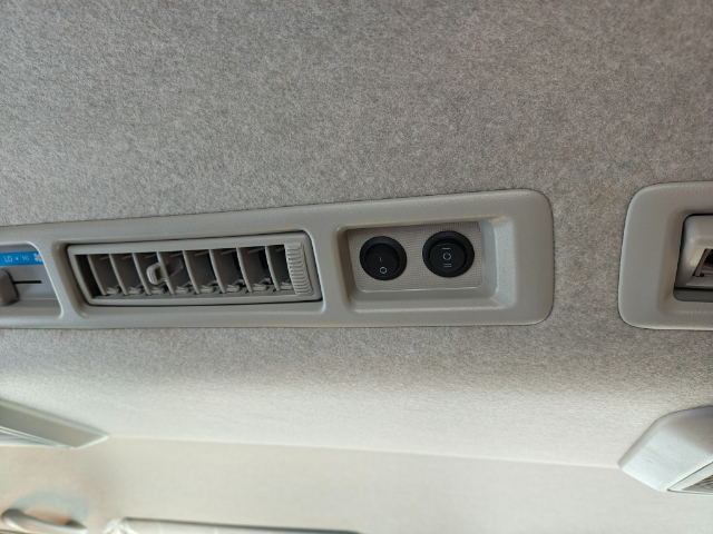 またリアエアコンの吹き出し口にもナビをサブバッテリーで駆動させるスイッチなどがあります。オプションでフリップダウンモニターをつけることもできるので、その場合このスイッチを押すことでナビをサブバッテリーで駆動させ、ナビのアンテナを使ってテレビを見ることができます。