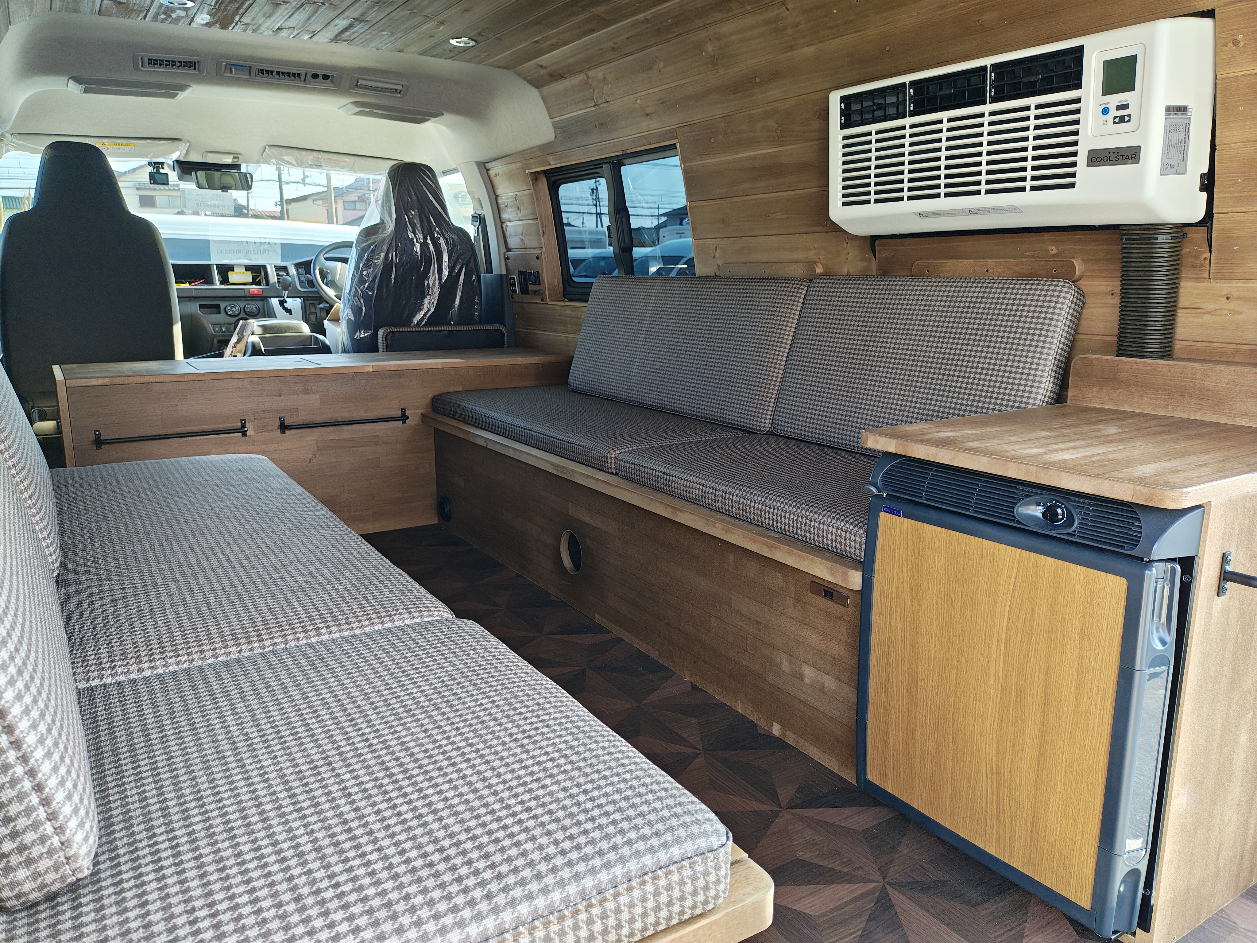 室内のレイアアウトはシンプルです。運転席の後ろにキッチンエリアが設けられ、後方にベンチシートが並んでいます。リアルウッドパネルが室内全体を覆っていて、木の香りが漂いリラックスできる空間になっています。写真をご覧頂けると分かるように、標準装備としてDCクーラーも付いているので夏のお出かけにもピッタリですね!