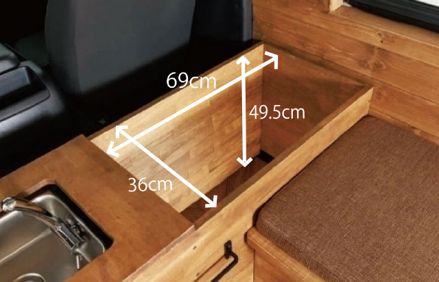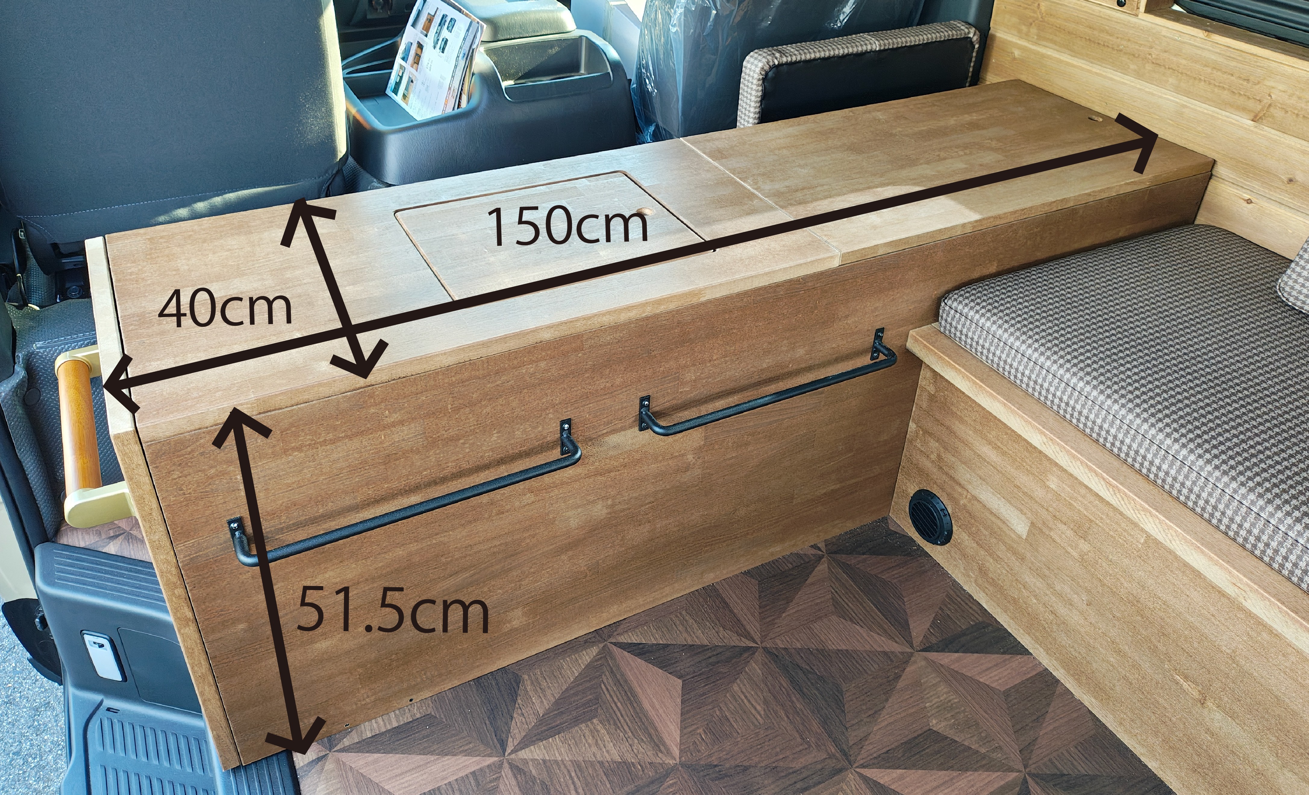 続いて、運転席の後ろに設置されたキッチンエリアを測っていきます!ちなみに家具にも無垢材が使われているので自分なりにカスタマイズすることもできますよ。シンク台のサイズは150cm×40cm×高さ51.5cmです。中心にはシンクがあり、運転席の真後ろ部分は大きな収納スペースが設けられています。収納スペースについては、後半でまとめてサイズをお伝えしますね。