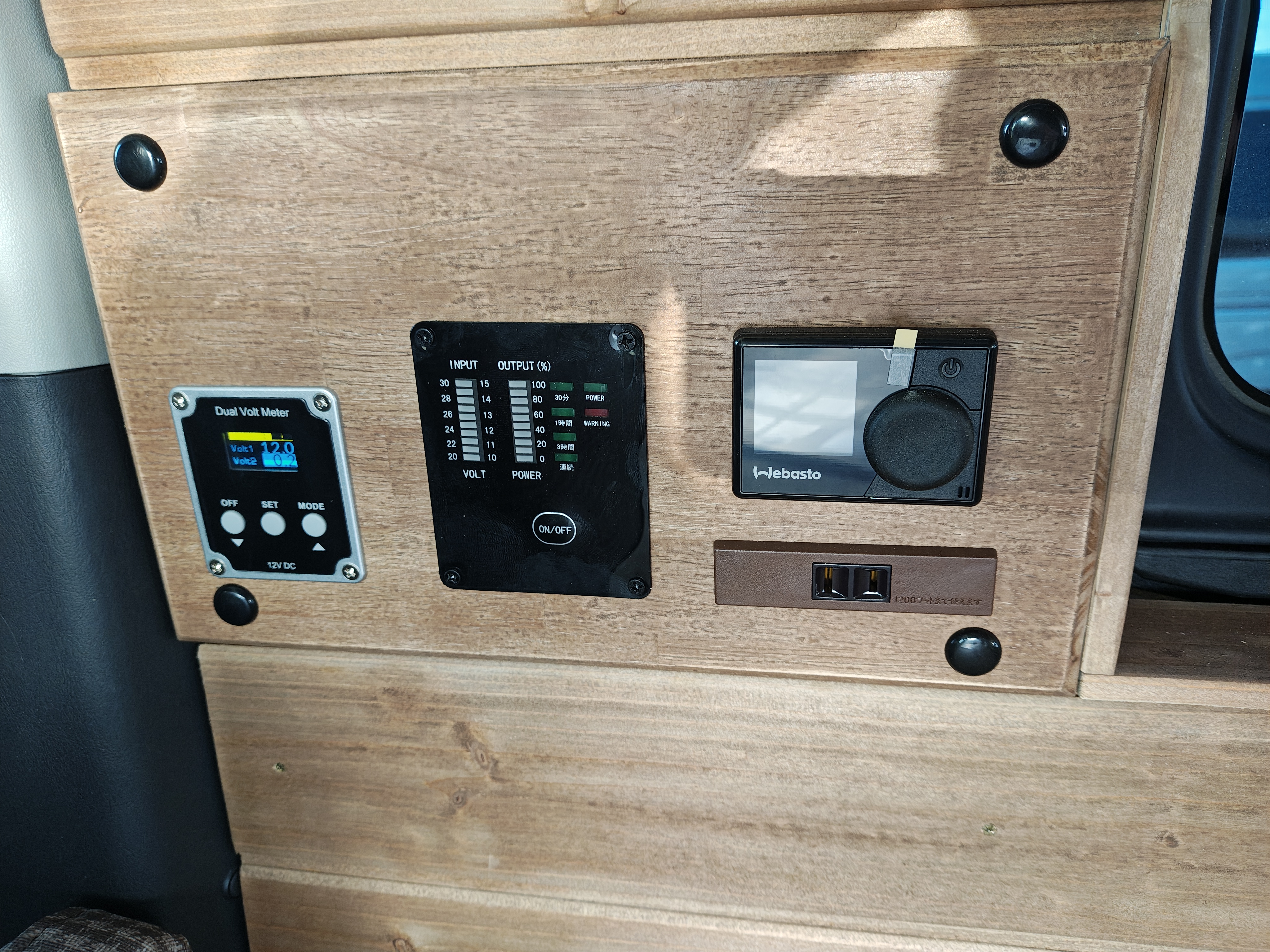 運転席の後ろにはスイッチ類があります。電圧計、インバーターのスイッチ、FFヒーターのスイッチ(オプション)、コンセントが一口あります。
