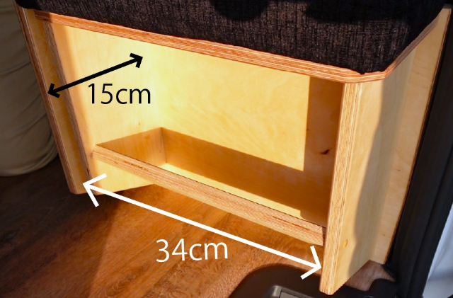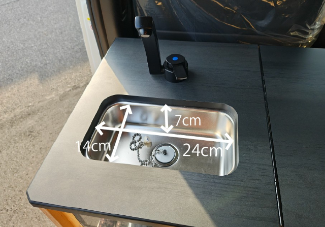 助手席の後ろには、コンパクトなシンクがあります。シンクは14cm×24cm×深さ7cmです。