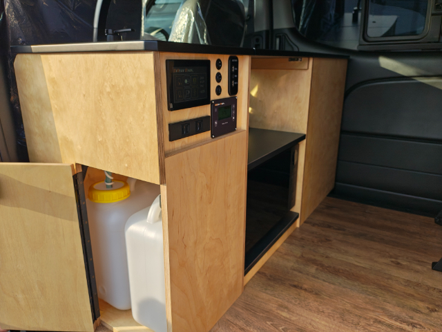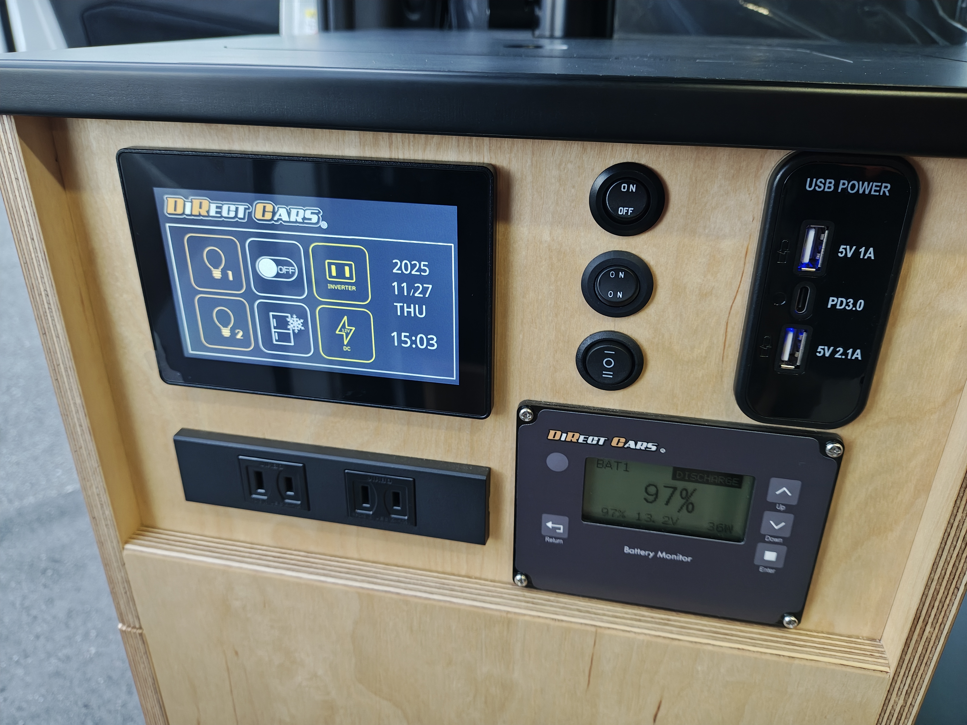 では最後に、「Michikusa(ミチクサ)」のスイッチ類、コントロールパネルを紹介します。助手席の後ろのキッチンキャビネットには、コンセント2口、USBポート2口、USB-Cポート1口、スイッチ類、バッテリー残量計、コントロールパネルがまとまっています。