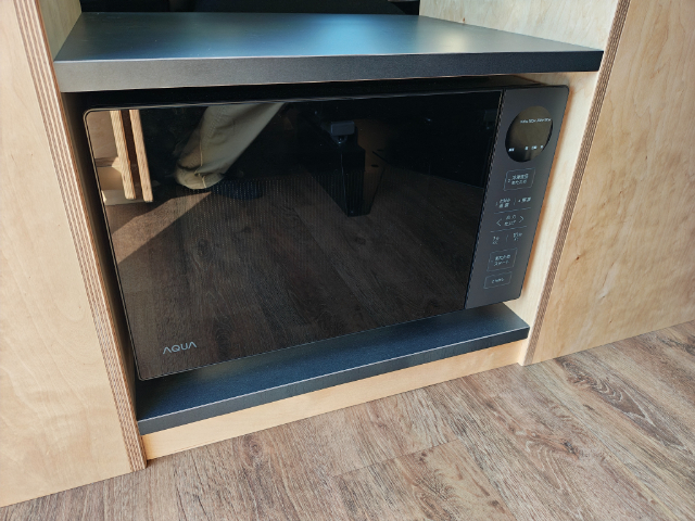 そして、キッチンキャビネットの中心部には、標準装備の電子レンジ!車中泊などにもありがたいアイテムですね!