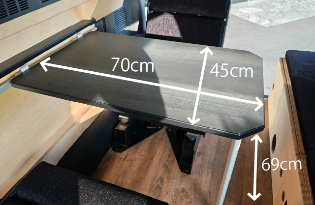 このテーブルには2本の脚が付いています。通常のシートの場合と、ベッド展開した場合と使い分けながら、テーブルが使えるのは便利ですね!