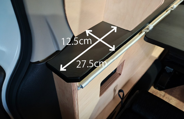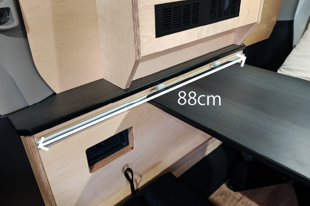 キッチンキャビネットの真ん中の天板は跳ね上げ式になっていて、ここを跳ね上げることで運転席、助手席から後ろへの通路にもなります。通路として使わないのであれば、カセットコンロなどを置いておくのもいいですね!