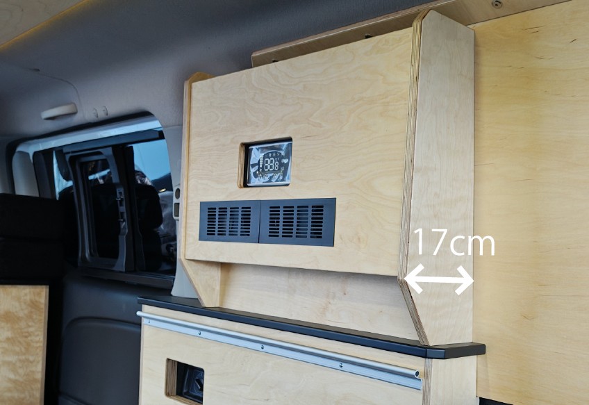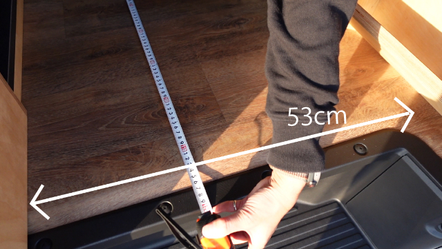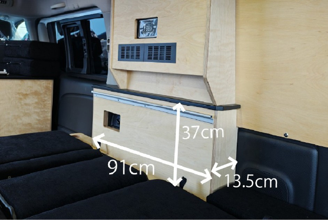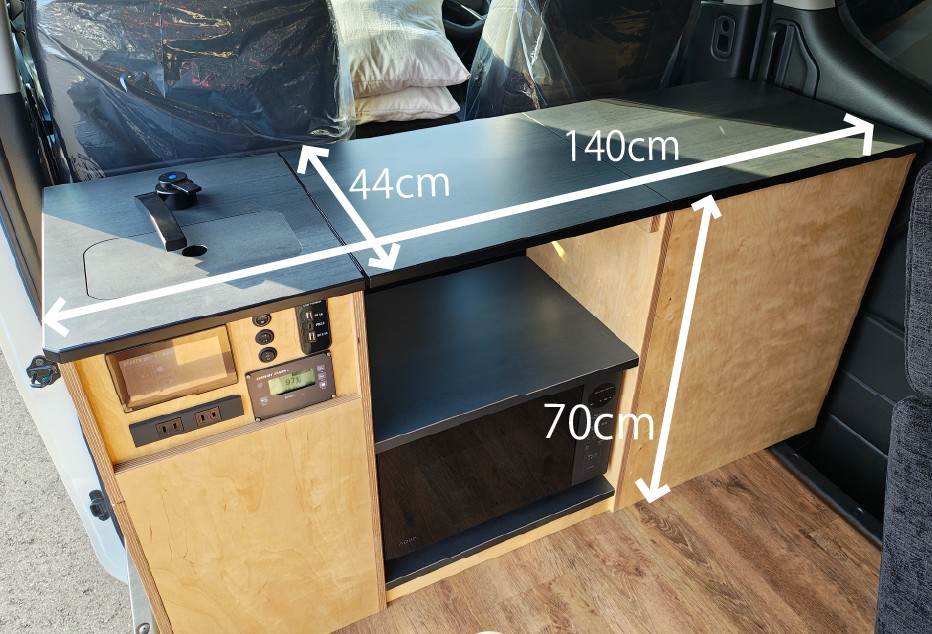 運転席、助手席の後ろにはキッチンキャビネットが設置されています。まずはこちらからサイズなども測っていきます!キッチンキャビネットのサイズは140cm×44cm×高さ70cmです。