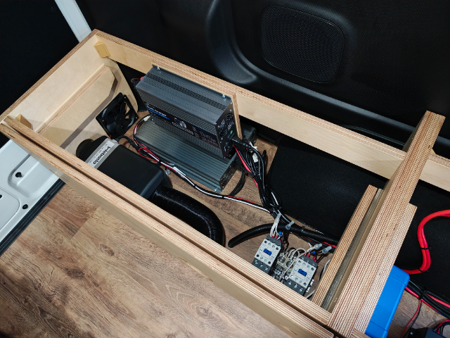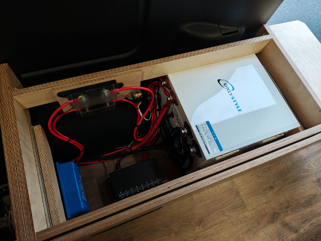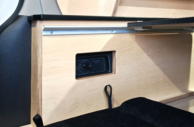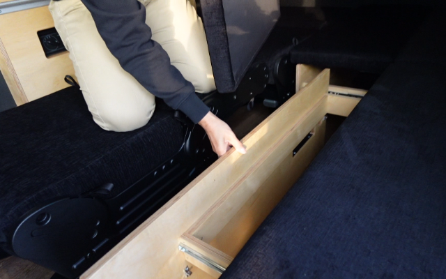サイドソファーの下には、標準装備のリチウムイオンバッテリー400Ah、1500Wインバーター、充電システムなどが入っています。