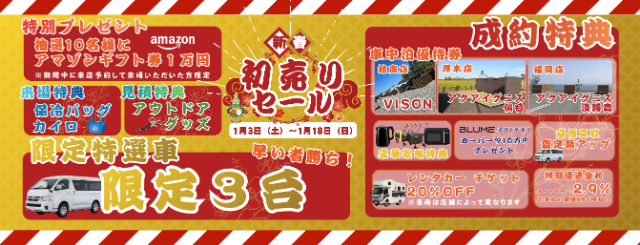 「ダイレクトカーズ」では、1月3日(土)~18日(日)まで初売りを開催いたします!ご成約特典も盛りだくさん!ぜひ「ダイレクトカーズ」の初売りにご期待ください!