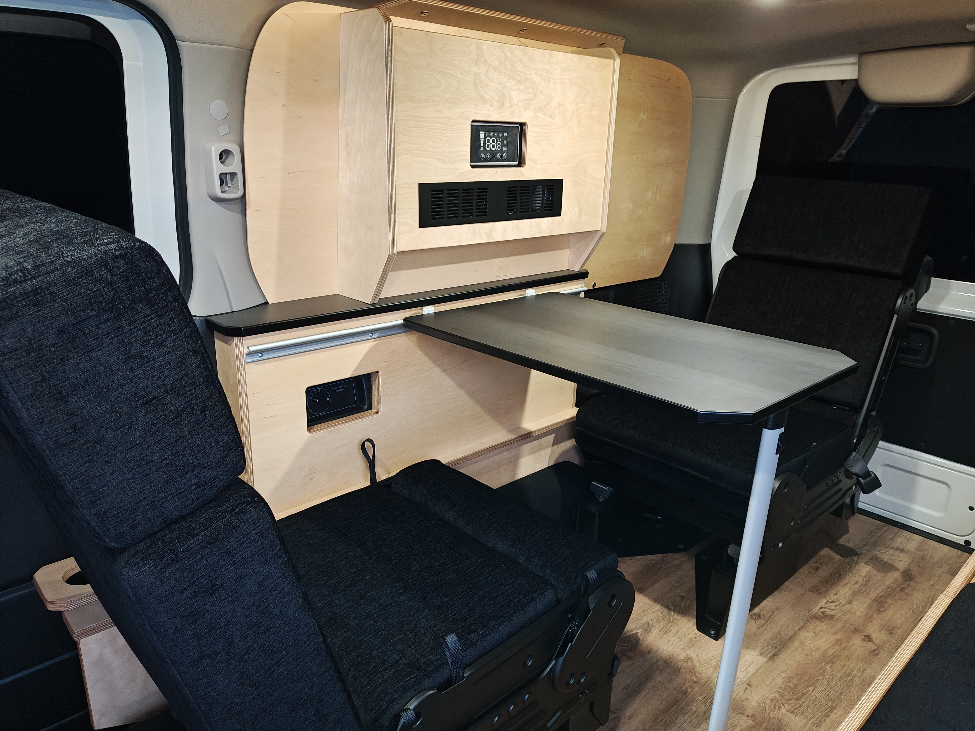 運転席の後ろには、冷凍も可能な車載専用のエンゲル冷蔵庫(40L)が設置されています。スライドドアからもアクセスしやすい場所なので便利ですね!