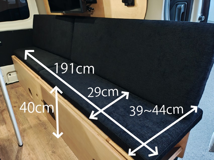 大画面モニター側には、幅191cmのサイドソファーがあります。背もたれがある状態では奥行は、29cmほどです。背もたれを外すと、39~44cmとなります。高さは約40cmです。