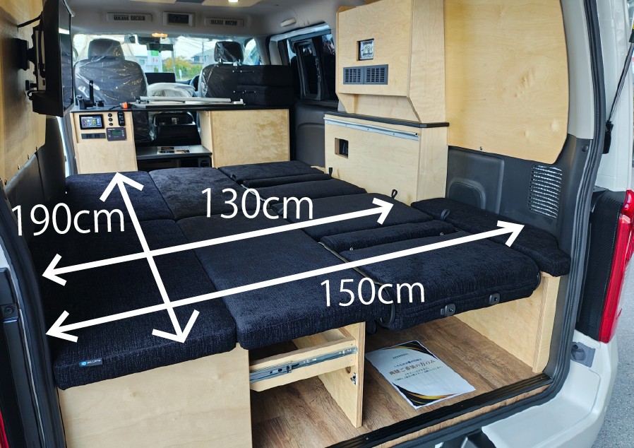 「Michikusa(ミチクサ)」は、冷蔵庫、電子レンジだけでなく、DCクーラー、大画面モニターも標準装備になっています。DCクーラーは目立たないように家具の一部にコンパクトに設置されており、車内空間を圧迫しません。(ちなみに張り出し部分は約17cmです)DCクーラーがあれば夏場の車中泊も快適ですね!