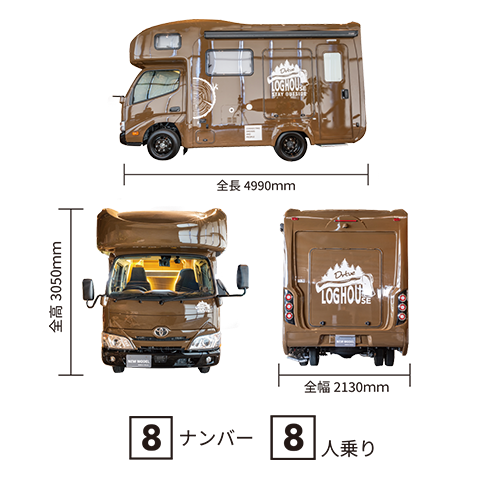 ベース車両はカムロード。2DWディーゼル、4WDディーゼルの設定があります。どれもリアタイヤがダブルタイヤになっているので、走行中の安定性も向上しています。また「LOGHOUSE」は、横幅こそ2mを超えますが、全長は5m以内に収まっていますので、扱いやすくなっています。