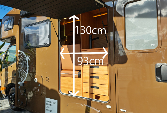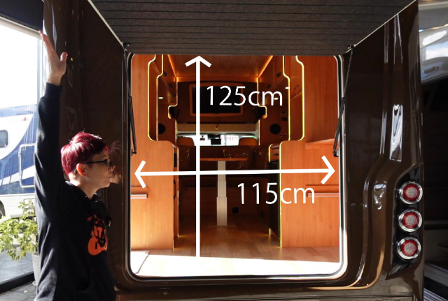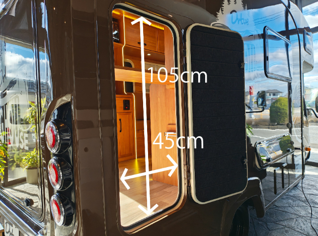 そして、こちら側にも大きな扉があります。リアゲート同様に上に跳ね上げるタイプの扉になっていて、開口部は幅93cm×高さ130cmです。