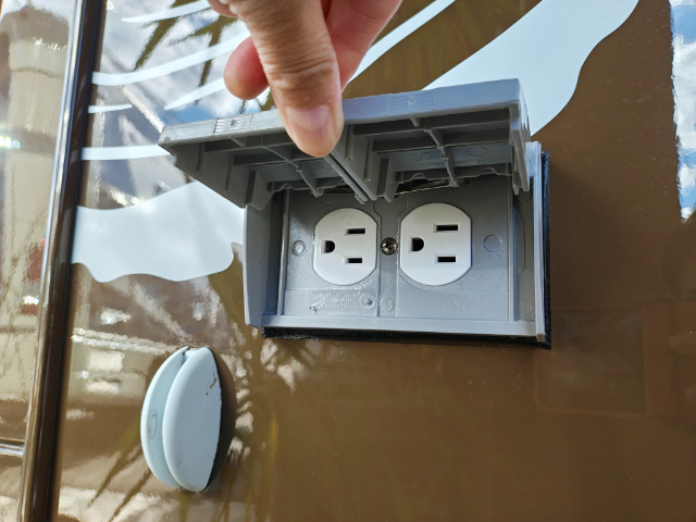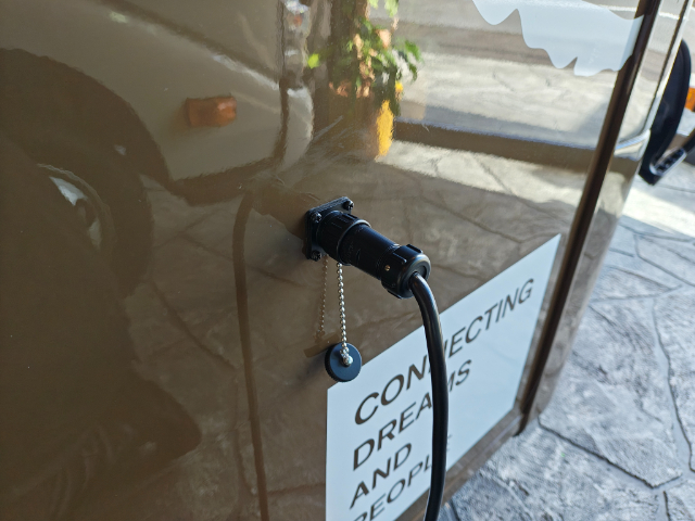 では、改めて外装部分をご紹介します。こちらは外部電源。運転席から降りてすぐのところについています。