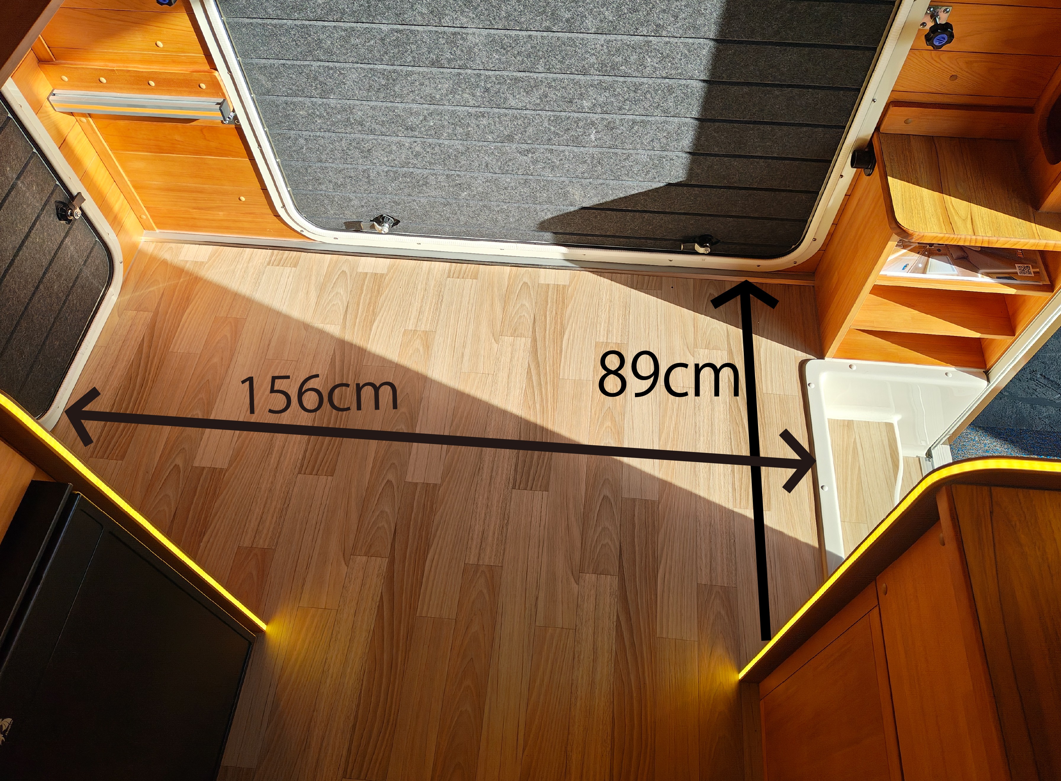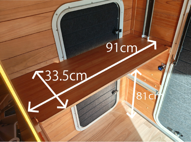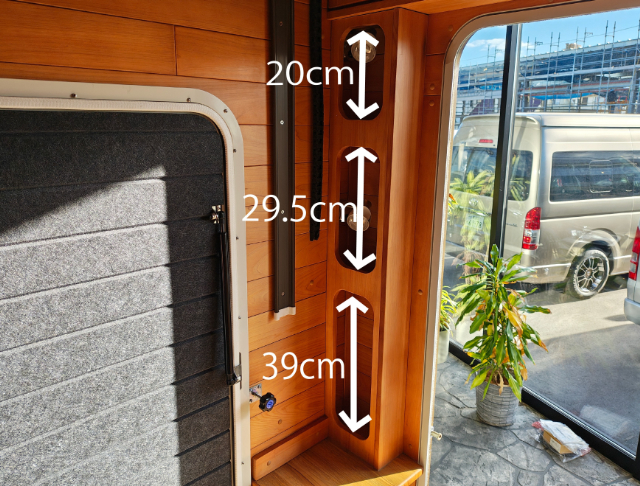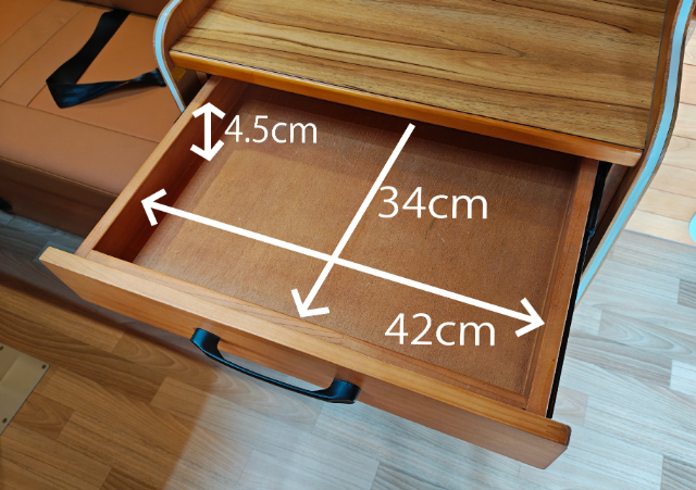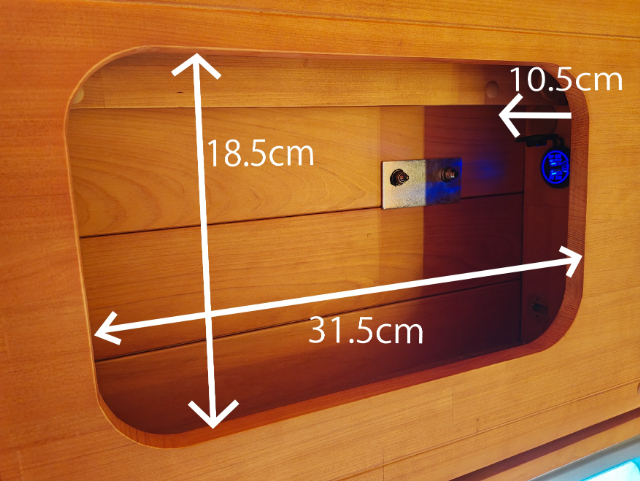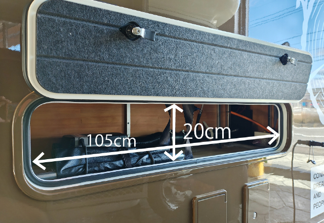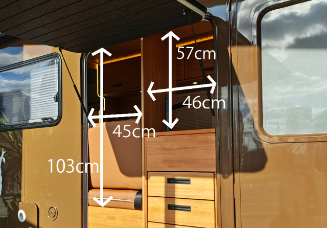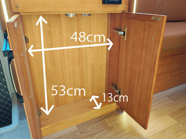 運転席側のソファー下には、標準装備のFFヒーターが装備されています。このスペースは、収納スペースとしても使えそうなのでサイズも測ってみました。屋外からもアクセスできる扉がついていて便利ですが、収納として使う場合は、FFヒーターのダクトや吸気口などに干渉しないように気を付けてくださいね!