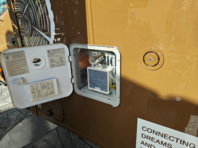 FFヒーターのコントローラーは、運転席後ろにあります。ダイネットから操作しやすい場所に取り付けられています。ちなみに、こちらに映っている「VOTRONIC」の電圧計はオプションです。