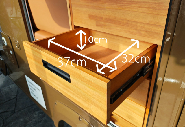 シンクの下には屋外で使える3段の引き出しが付いています。引き出しのサイズは、3段とも全て同じで、幅37cm×奥行き32cm×深さ10cmです。