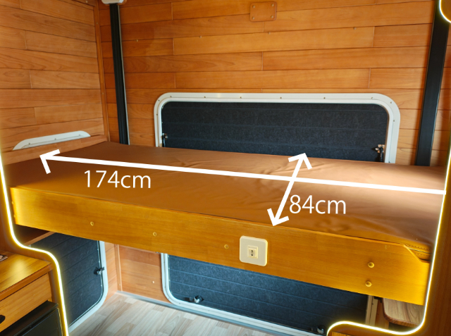 電動昇降リアベッドのサイズは、全長174cm×84cmです。昇降する分、不安定なのかなと心配しましたが、乗り降りする時にもグラつくことはなく、しっかり安定していました!