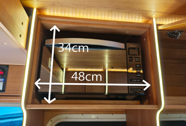 まずは電子レンジの収まっている棚のサイズは、幅48cm×高さ34cmでした。