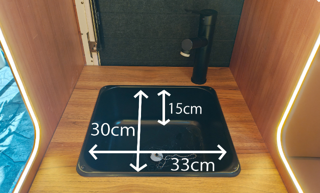 真ん中に仕切り板があるので、広い開口部を全面使うことができませんが、シートの背もたれを外すと幅45cm×高さ103cmほどの広さはあります。またその横はキッチンスペース(シンク)になっているので、幅46cm×57cmのスぺースからホースを伸ばして屋外でシャワーを使う事もできます。